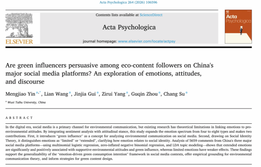 近日,无锡太湖学院商学院教师殷梦娇主持的江苏省教育厅哲学社会科学研究课题《绿色消费KOL社交媒体影响力的AI文本挖掘研究》(项目编号:2025SJYB0693)取得阶段性重要成果。课题组学术论文成功发表于国际心理学领域期刊《Acta Psychologica》,并获该领域学者推荐,标志着我校科研工作国际影响力进一步提升。