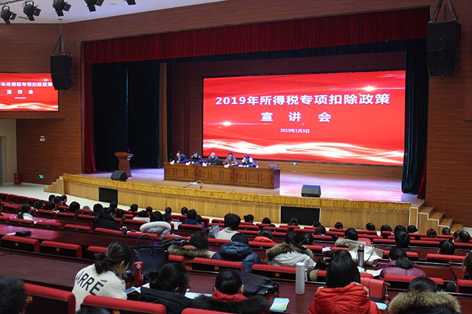 本网讯 1月3日下午, 无锡太湖学院2019年所得税专项扣除政策宣讲会在工科楼报告厅举行。大会邀请无锡市税务局第一分局相关业务专家来我校进行所得税专项扣除政策宣讲和业务指导,各学院、相关职能部门中对个人所得税专项附加扣除政策感兴趣的老师参加了本次培训。大会由金成副校长主持。