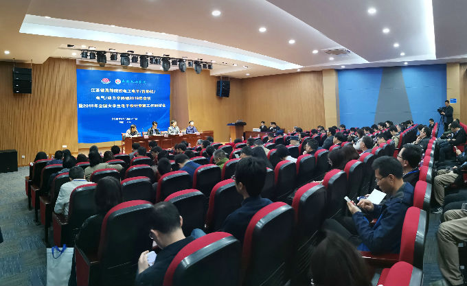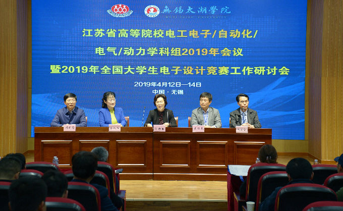 本网讯 2019年4月13日,江苏省高等院校电工电子/自动化/电气/动力学科组2019年会议暨江苏省2019年全国大学生电子设计竞赛工作研讨会,在无锡太湖学院大学生活动中心报告厅隆重举行。来自江苏省各高校代表及大赛专家共约140人参加了本次研讨会,无锡市人大常委会副主任华博雅,我校理事长、党委书记金秋萍出席大会。