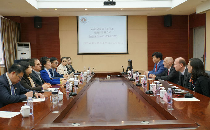 本网讯 近日,英国安格利亚鲁斯金大学副校长Gary Packham教授、国际事务部部长Simon EVANS教授、金融、经济与法律学院院长Ying XIE教授等一行五人访问无锡太湖学院,双方就共同举办的ACCA国际合作项目展开深度讨论。党委书记金秋萍致欢迎词,副校长陈鹏飞主持会议,会计学院院长唐建荣、副院长唐红珍、国际交流与合作处副处长杜玮等领导参加了会议。
