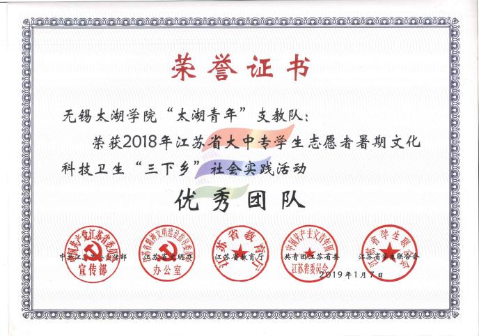 “太湖青年”支教队获江苏省大中专学生志愿者暑期文化科技卫生“三下乡”社会实践活动优秀团队