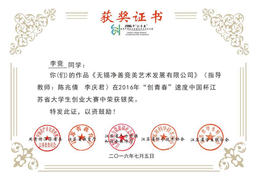 李竞荣获“创青春”江苏省大学生创业大赛银奖