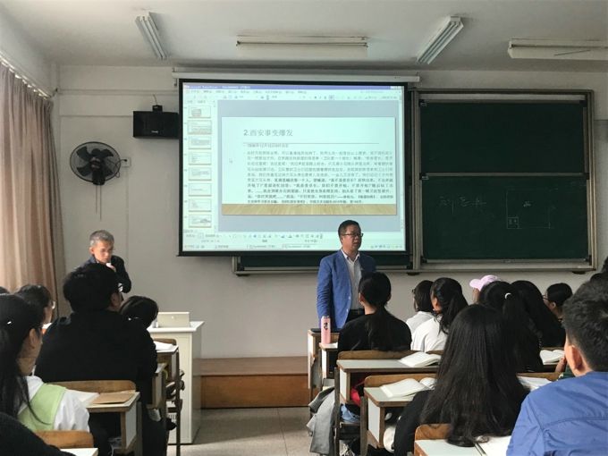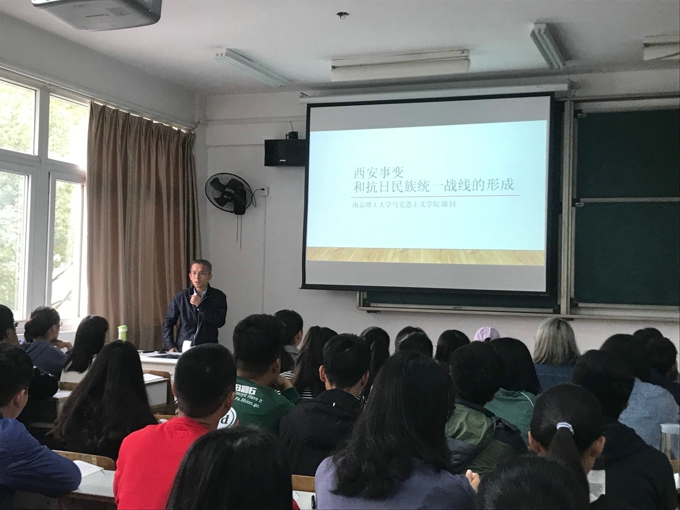 本网讯 金秋十月,丹桂飘香。为了落实教育部《关于狠抓新时代全国高等学校本科教育工作会议精神落实的通知》精神,打造“金课”、淘汰“水课”,进一步提升教学质量,我校马克思主义学院特邀南京理工大学马克思主义学院陈钊教授来我校讲学。2019年10月23日,陈钊教授在7号楼213为我校师生作了题为“西安事变与抗日民族统一战线的形成”的示范课教学。马克思主义学院全体思政课教师及其他院系部分教师学生参加了此次教学活动。