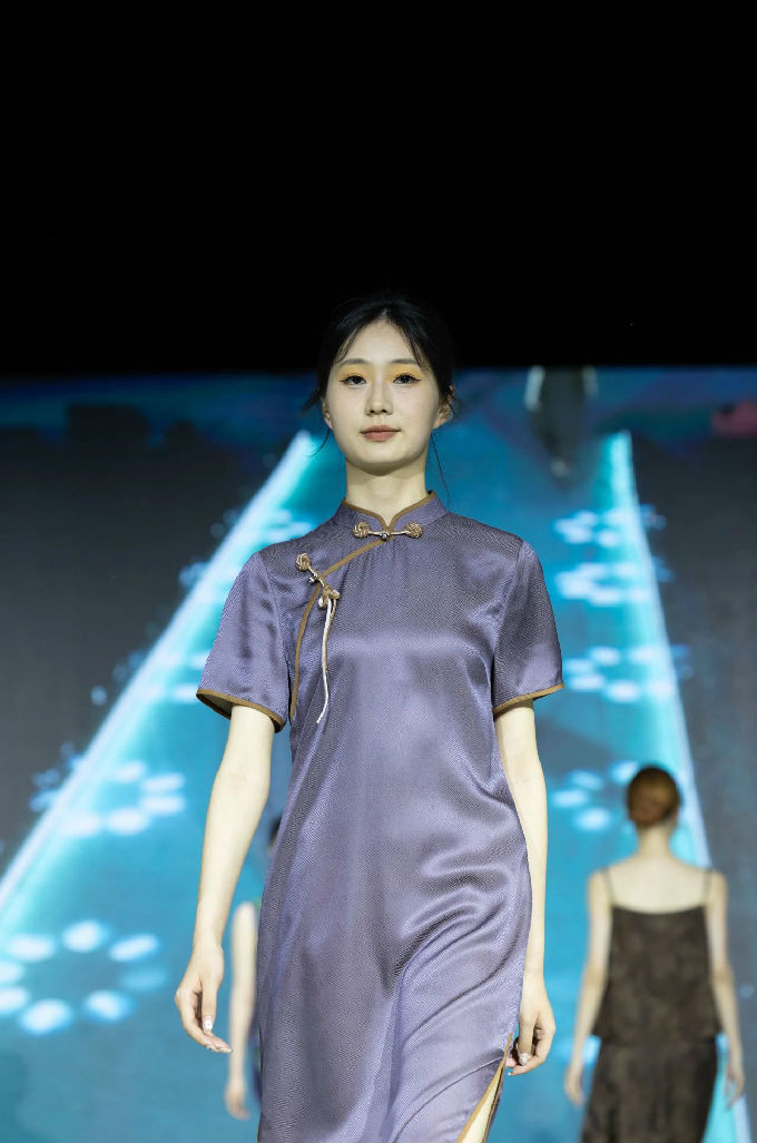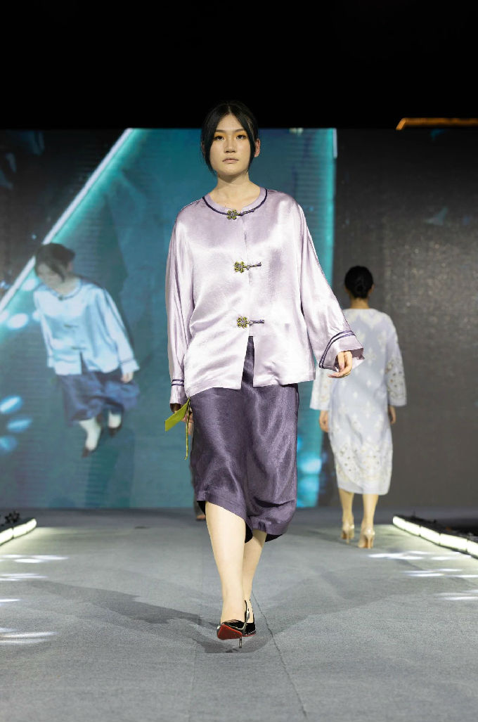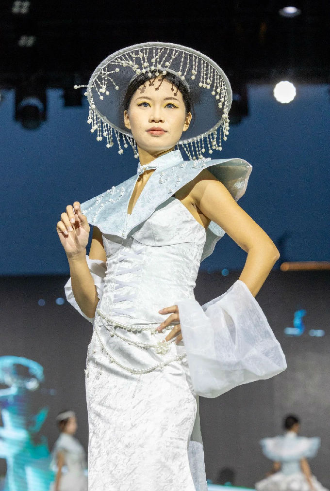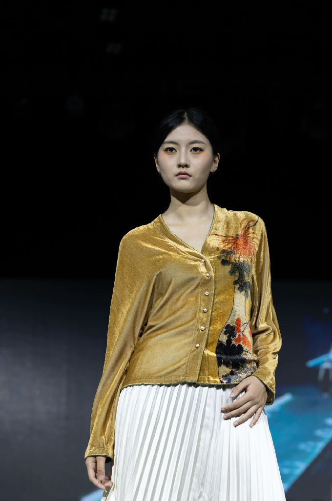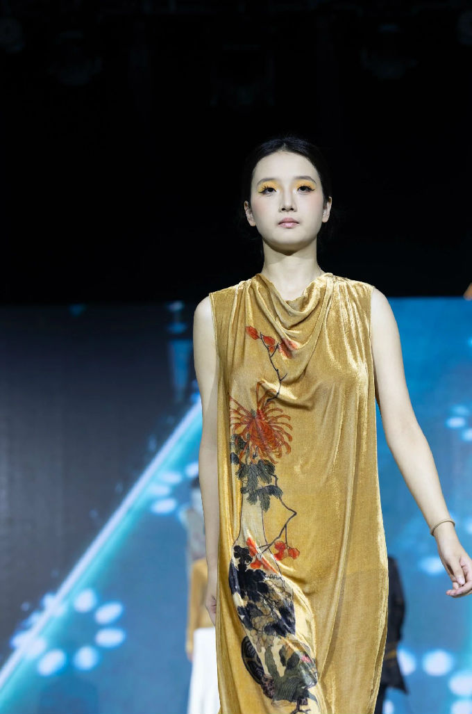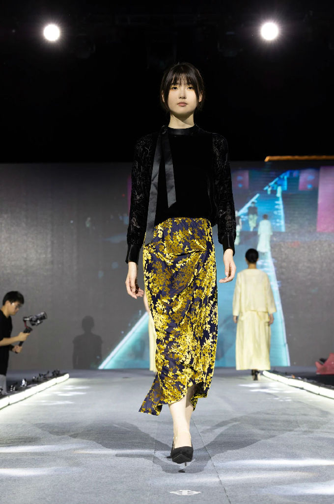 本次走秀的高潮部分,莫过于第三篇章——教师产学研原创品牌“荣”新品发布展演。这个新中式风格的品牌,不仅展现了太湖学院教师们的产学研成果,更体现了他们对传统文化的热爱与传承。发布会上,一系列设计独特、制作精良的新品逐一亮相,赢得了现场观众的热烈反响。这些作品不仅展示了设计才华,更树立了榜样 ,激发了同学们对艺术创作的热情与追求。