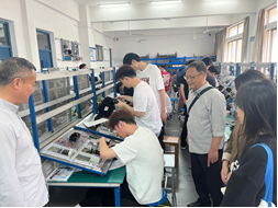 常州工业职业技术学院的王老师和常州纺织工业学院的蒋老师带大家参观了实训室,针对实训项目及实训过程中的许多具体问题进行了深入交流。王老师介绍了该校 "项目导入-分段实训-技能竞赛" 的三层培养模式,蒋老师从学实践的角度出发展示了教学成果。最后,大家结合不同专业、学历层次学生和学校特点进行了交流。