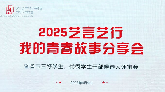 为进一步推进学风建设,鼓励广大学生爱国励志、求真力行,积极向优秀标杆学习,用奋斗与责任绘就新时代青年的青春担当,塑造良好的学院氛围,艺术学院于4月9日下午在大学生活动中心A三楼报告厅举办了新一期我的青春故事分享会暨2025年度省市三好学生、优秀学生干部候选人评审会。