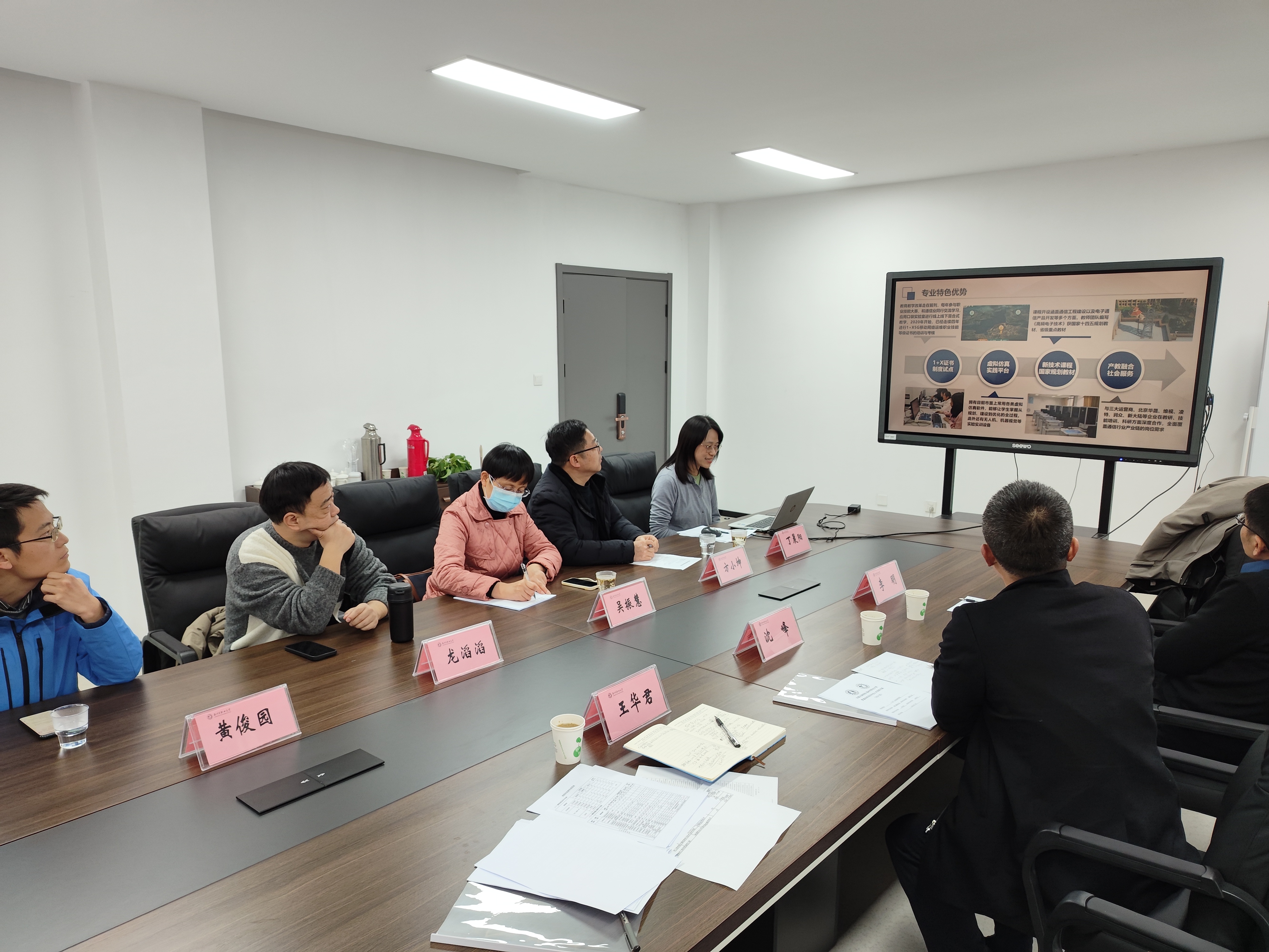 双方参会人员除无锡太湖学院物联网工程学院三位领导外,还包括扬州市职业大学电子学院吴振慧院长、方小坤副院长、现代通信技术专业丁晨阳主任、龙滔滔老师和黄俊园博士。双方代表共同探讨了3+2贯通培养的人才培养方案制定、学生转段要求和学生后续工作对接等问题,并由此达成了一系列共识。