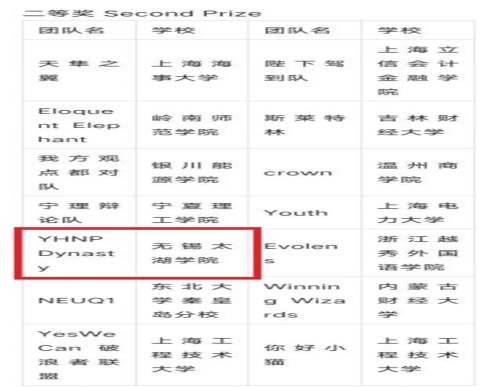 我校文法学院商务英语系的张雅洁、张以和、陈安娜和潘安彤四位同学组成的代表队YHNP Dynasty,代表无锡太湖学院参赛。在文法学院商务英语系主任吴洁老师、商务英语专业邵文轩、高阳阳老师的悉心指导下,我校辩论代表队经过资格赛、初赛、江苏省复赛、全国总决赛四轮连番激烈角逐后,从初复赛新能源汽车出海的国际化方案设计到总决赛对不同目的地区的辩论舌战,她们凭借扎实的语言功底、严密的逻辑推理、灵活的应变能力和精湛的辩论技巧,一路过关斩将、闯关夺隘,斩获全国二等奖,充分展现了我校学子的风采。