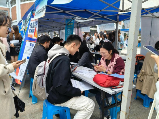 秋日的一个清晨,同学们陆陆续续来到了商学院招聘会现场。有序地排队了解每家企业的招聘要求,仔细与自己的专业就业方向进行对比。同学们热情的态度展现出了对此次招聘会的认可与重视。