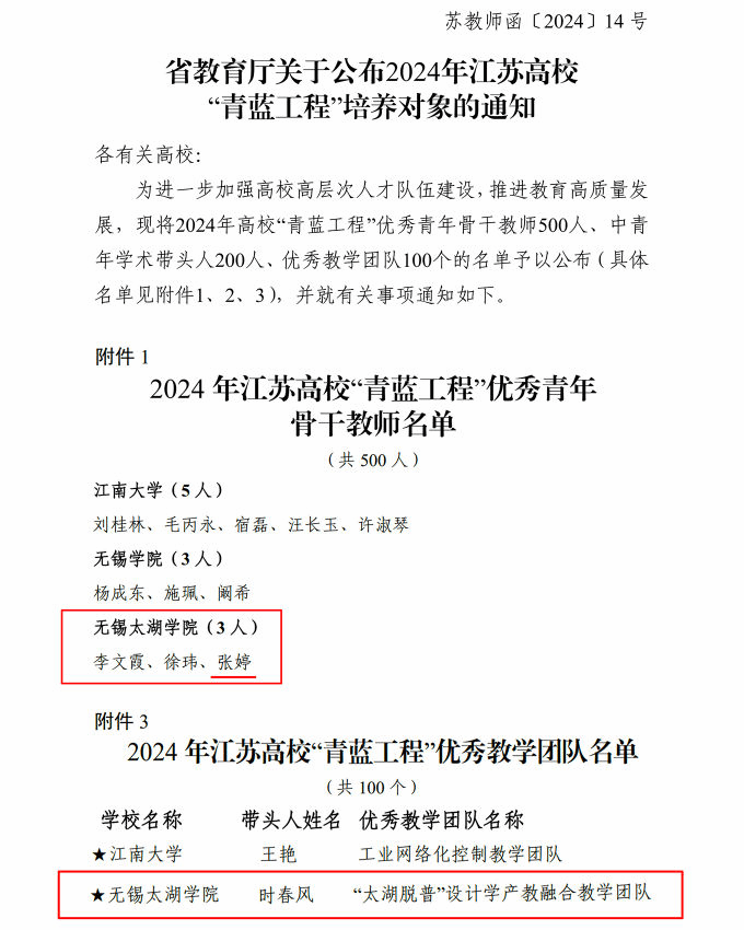 近日,江苏省教育厅下发了《省教育厅关于公布2024年江苏高校“青蓝工程”培养对象的通知》(苏教师函〔2024〕14 号),以我院时春风副教授为团队带头人的“‘太湖脱普’设计学产教融合教学团队”入选省“青蓝工程”优秀教学团队培养对象,张婷博士入选省“青蓝工程”优秀青年骨干教师培养对象。值得一提的是,江苏省“青蓝工程”优秀教学团队为我校首次获得,实现了我校该类别人才项目零的突破。