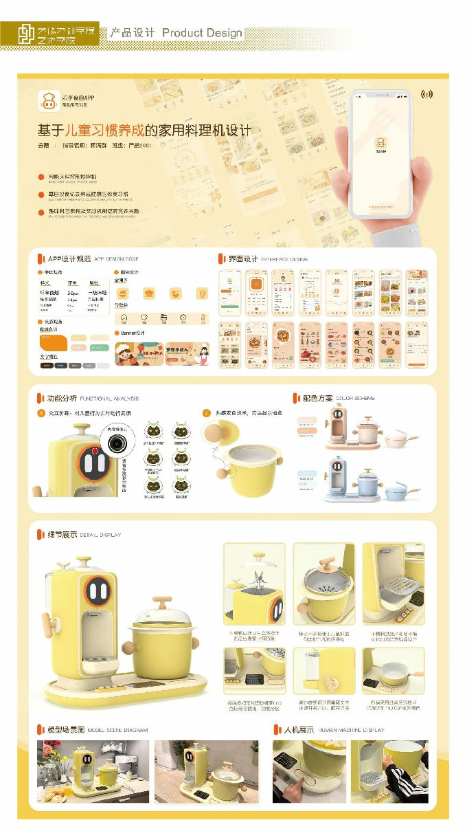 针对儿童习惯养成的家用料理机设计,外形灵感来源于“小黄人”的卡通形象,产品外型圆润可爱,具有亲和力,旨在营造生动、有趣的使用体验,以吸引儿童的使用兴趣。该款料理机通过模块组合形态,在功能设置上将料理机的整体功能区分为搅拌区和烹饪区,通过微晶面板可进行蒸煮和煎炒等料理。产品设计配套APP,可与手机互联,实现智能化远程操控,更多的交互使用体验促进儿童的习惯养成,并满足儿童在成长过程中不同的烹饪需求,实现多功能形式。