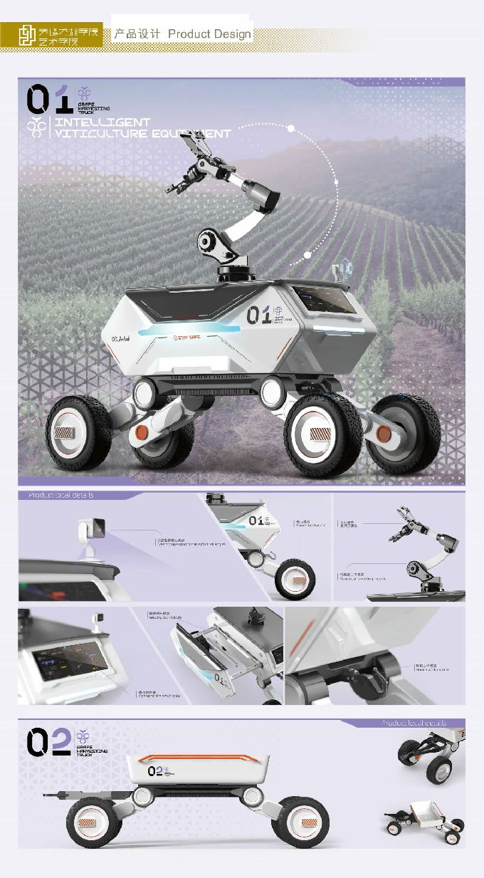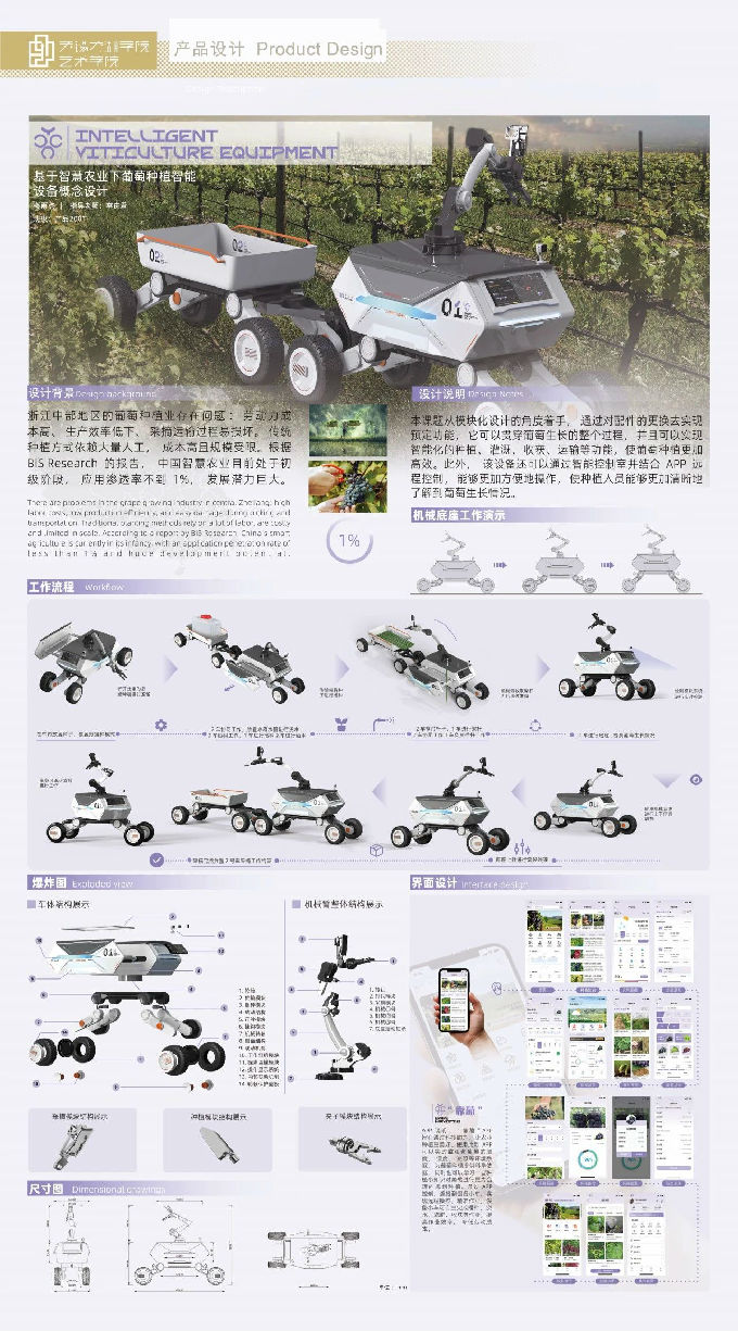 本课题从地域化出发,针对浙江中部地区的葡萄种植产业,从模块化设计的角度着手,通过对配件的更换去实现预定功能。通过设计贯穿葡萄生长的整个过程,并实现智能化的种植、灌溉、收获、运输等功能,使葡萄种植更加高效。此外,该设备还可以通过智能控制室结合APP实现远程控制,操作更加方便,使种植人员能够更加清晰地了解到葡萄生长情况。