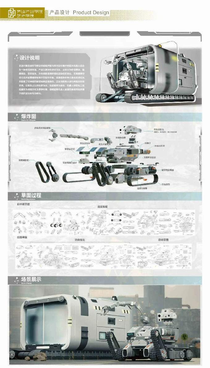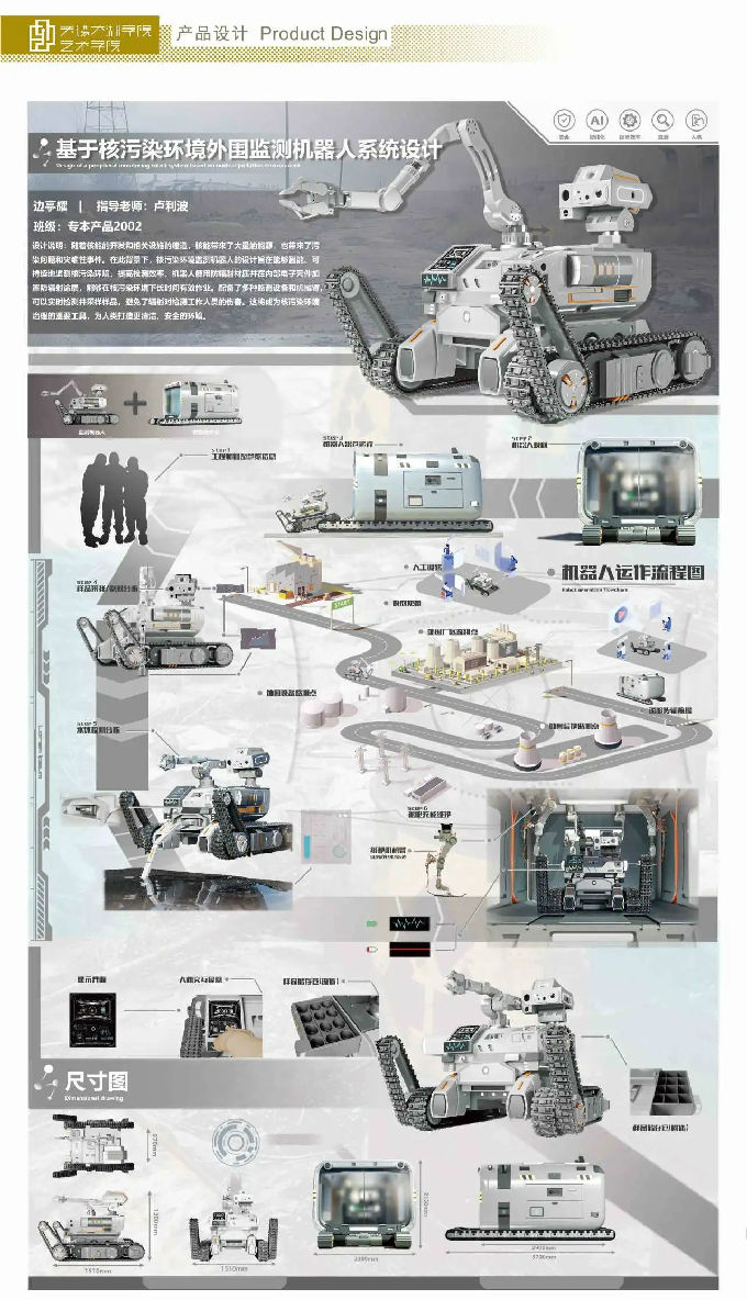 随着核能的开发和相关设施的建造,核能带来大量的能源的同时,也带来了污染问题和灾难性事件。在此背景下,核污染环境监测机器人的设计旨在能够智能、可持续地监测核污染环境,提高检测效率。机器人使用防辐射材质并在内部电子元件加置了防辐射涂层,可以实现在核污染环境下长时间有效作业。该产品配备了多种监测设备和机械臂,可以实时检测并采样样品,避免辐射对检测工作人员的伤害。