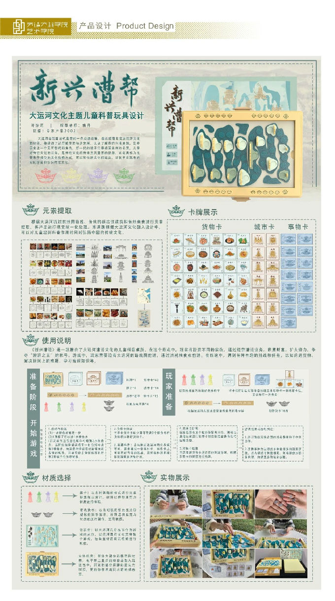 “新兴漕帮”以电子立体棋盘与卡牌相结合的创新方式去引导儿童了解大运河文化。通过电子立体棋盘消耗粮食点运输货物卡的游戏方式向儿童传输了大运河漕运文化与运河城市的美食文化、非遗文化。在立体棋盘上,一条河流连接杭州和北京,沿线有14座城市作为游戏点位。这些城市以标志性建筑或景点剪影代表,其中五个分界城市设有事件卡,模拟古代漕运的突发状况。玩家消耗电子屏上的粮食点运送货物卡,体验古时漕运的艰辛,同时锻炼加减运算能力。货物卡包括美食卡和非遗卡,美食卡代表粮食,非遗卡代表进贡品,它们不仅是城市特色的体现,也是玩家在游戏中追求目标的重要道具。通过对大运河文化及沿线城市的深入研究,将历史、文化、策略等元素融入到了这款儿童科普玩具当中,激发儿童对大运河文化的兴趣,促进对大运河文化的传承与弘扬。