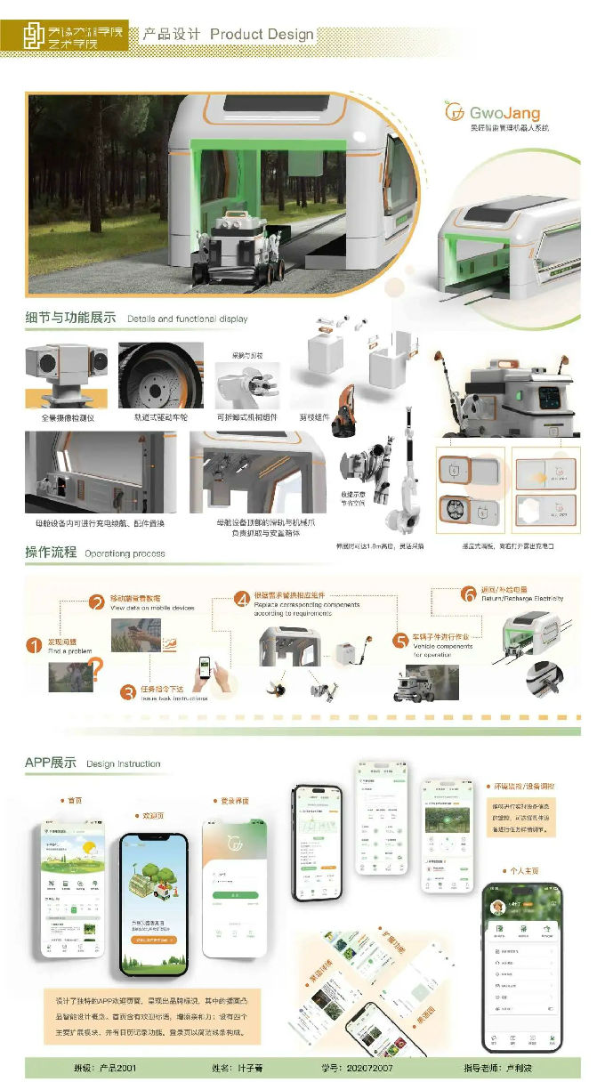 本系统是在智慧农业的发展背景下,遵循可持续发展原则,实现管理人员对百香果园情况的远程监测与控制,并通过模块化形式满足百香果作物在不同生长时期所采取的各种措施需要,能够帮助百香果园管理者提升作业效率,提高果品质量与产量。利用移动端APP辅助的方式来提高管理人员操作过程中的交互体验感和人机协同性,兼顾在百香果各个生长周期中所对应的养护操作和不同模块组件之间的搭配关系,并结合新兴技术设计出对应功能的百香果园管理机器人系统产品。