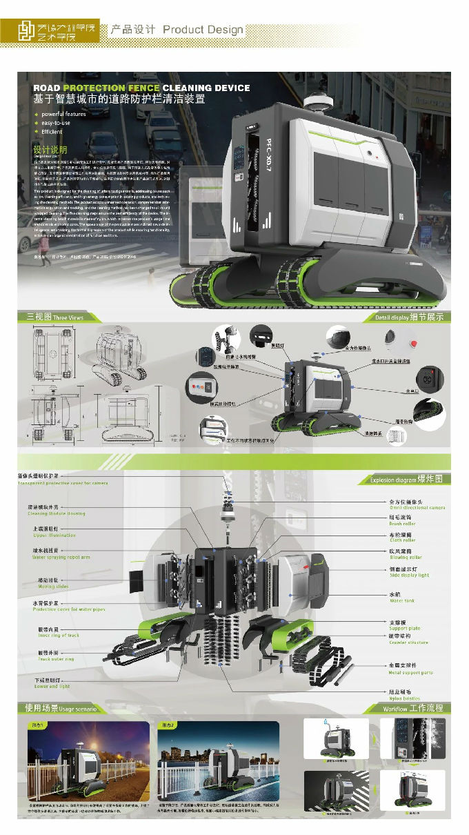 该产品针对城市道路防护栏的清洁工作进行设计,改变现有产品清洁效率低、耗能大等问题,是对清洁方式的重新思考。产品采用无人化操作,全方位信息获取与跟踪。其中清洁方式改变为全方位包裹式清洁,五个清洁步骤让装置工作效率达到最佳,内部清洁刷材质选用尼龙材质,可以增加产品使用时长,控制经济成本。产品外观更加偏向于智能化,在保证功能的同时也注重产品的形式表达,达到功能与形式的有机结合。