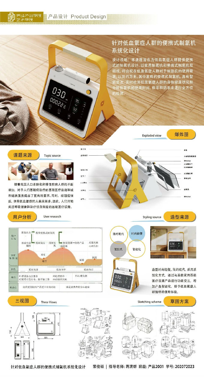 本设计旨在为低血氧症人群提供一个轻便、高效、可靠的便携式制氧机。主要针对需要长期或临时外出活动的患者,以确保他们在任何环境下都能获得稳定的氧气供给,从而改善生活质量。整体以家用主体制氧机和外带便携式制氧机双组成,家用主体制氧提供长期稳定的氧气,以达到氧疗健康生活方式,外带便携式制氧机应对在户外紧急情况下的缺氧症状,满足低血氧症人群的外出活动需求。以简约为主。其中便携式制氧机,具有智能交互,实时检测低血氧症人群的身体健康状况和分析制氧机的使用时间、频率和功率来进行全方位的检测,通过检测数据,以便提供给低血氧症人群更好的治疗方案。