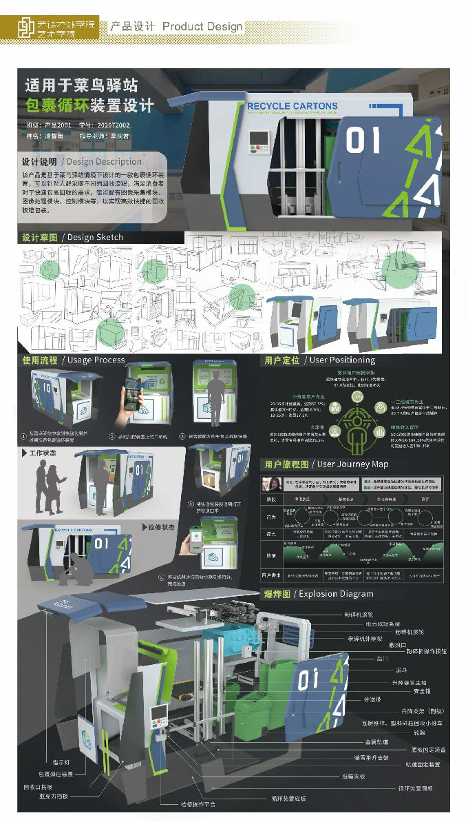 该产品是基于菜鸟驿站情境下设计的一款包裹循环装置,可以针对不同人群采取不同的回收方式,满足消费者对于快递包装回收的需求。装置配有图像采集模块、图像处理模块和控制模块等,共分为人机交互区、包裹处理区以及存储区三个部分,并根据装置的使用流程设计了UI界面,提高用户的使用体验的同时,可以实现高效快捷的快递包装回收流程。