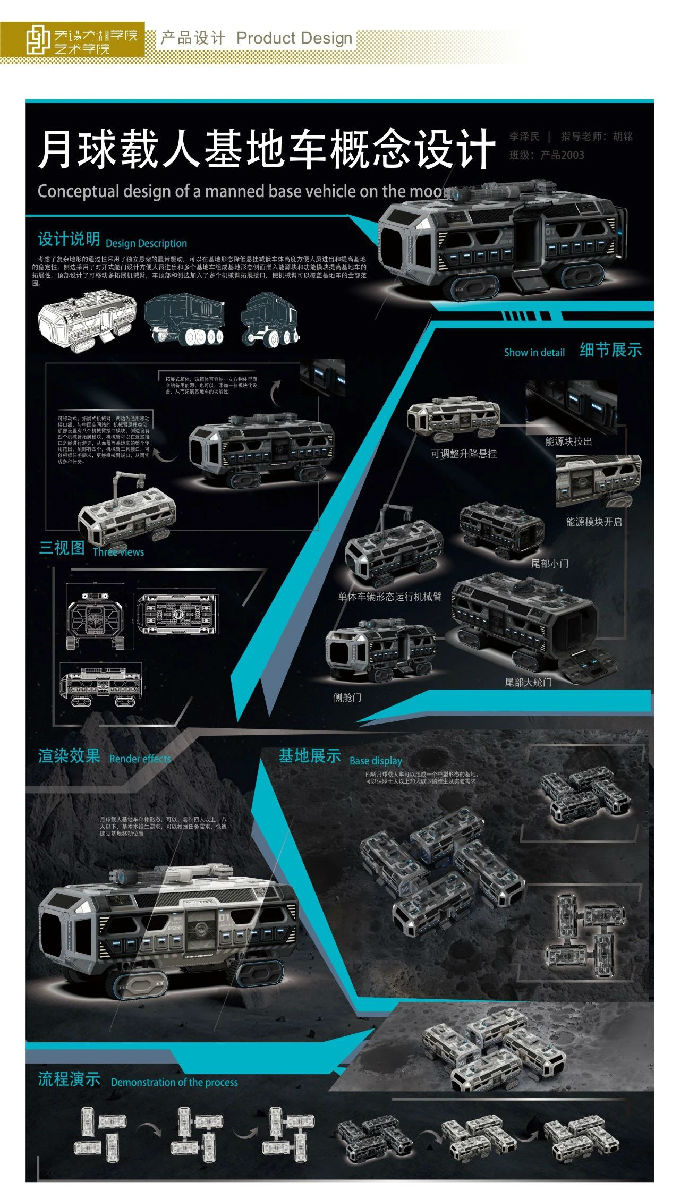 月球载人基地车主要功能包括月球考察、长期驻留、应急冗余备份以及作为移动基地等。为满足长期驻留需求,月球车需具备稳定可靠的维生系统、宽敞的内部空间和适应复杂地形的优越通过性。考虑到月球环境的特殊要求和基地属性,月球载人基地车设计上将充分结合基础形态特征,以确保车辆具备优异的通过性和功能性。与此同时,该设计充分考虑能源来源和能源配置,以应对月球长期驻留的挑战。此外,为满足不同探月任务的需求,月球车还将配置相应的模块化设施,方便根据实际情况更换部分配件,提高车辆的灵活性和适应性。舱门接口丰富同时具有多个拓展接口,可连接多辆车组成大型月球基地。