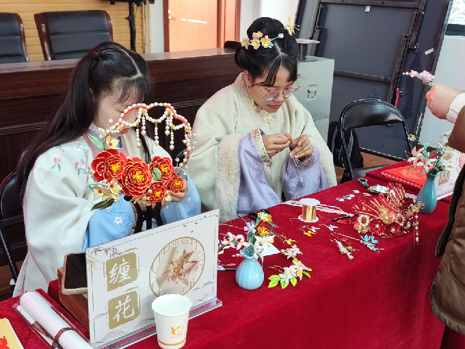 现场人气最旺的属朱倩静和她的伙伴带来的非遗技艺“缠花”,用多色丝线在纸板和铜丝扎成的人造坯架或实物坯架上缠绕出花、鸟、鱼、果等美术品,栩栩如生。该技艺是一种独特非物质文化遗产,朱倩静说,自己喜欢,疫情期间无事可做,在网上迷上了这种非遗技术,开始学做各种佩饰、头饰。几年下来,她的丝线绕得均匀而整齐,做出一个个精美的胸针或是簪子,让女生们都爱不释手。