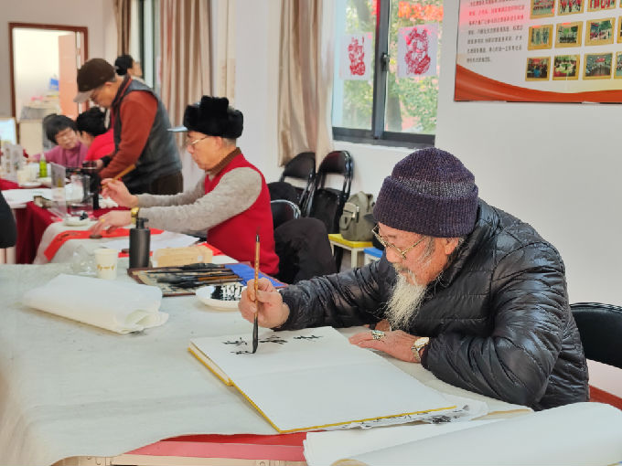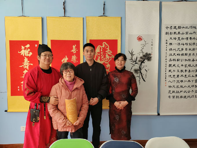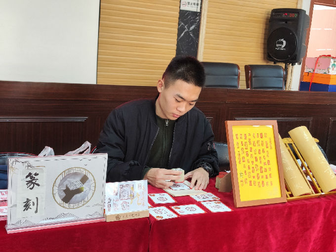 陈同学2018年在市图书馆参加过一次送福活动,爱上了篆刻技艺,自己还开过展。中间,他去部队当了几年兵,他的手艺也在部队受到了欢迎,作品放进了军营的荣誉室。年轻的他,如今已是西神印社的成员。“年轻人学非遗多了,技艺才能走得更远”,陈昊愉表示,现在身边喜欢这些国潮的人也多了起来。最年长的书法家徐文富已虚岁九十,现场创作的“金龙迎春”亦书亦画,非常有创意。