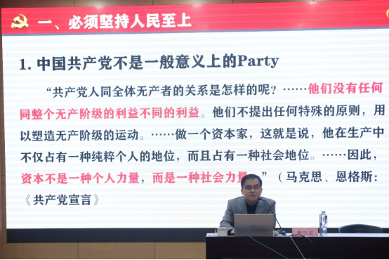 唐教授围绕六个“必须坚持”出发,逐一进行讲解。他结合学生的实际情况,用通俗易懂的语言和生动鲜活的案例向师生指出,六个“必须坚持”不仅为系统总结百余年党史奋进经验、推进马克思主义中国化时代化提供了科学的世界观和方法论,还为提升党的领导水平和执政水平、推进中华民族伟大复兴提供了行动指南。