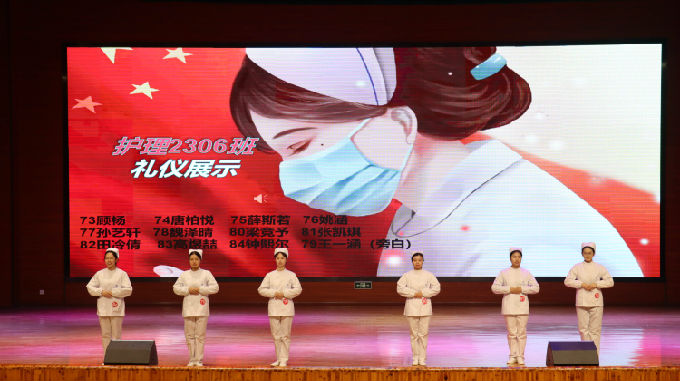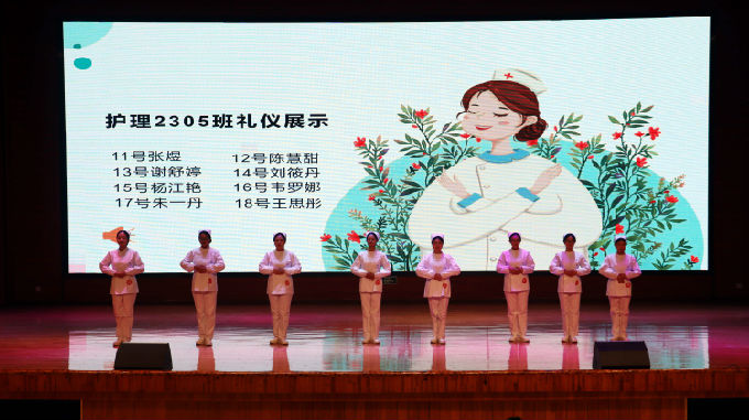 在礼仪展示中,参赛选手们自信大方、优雅得体、举止端庄,生动展示了仪容仪表、站姿、坐姿、行姿、蹲姿、持病例夹、推车行进等基本职业礼仪,充分展现出参赛团队的良好精神风貌和护理人文关怀精神。在才艺表演中,参赛选手们以朝气蓬勃的面貌进行了情景剧、舞蹈、手势舞、诗词朗诵等多种形式的表演,让全体师生感受到了他们绚丽绽放的青春活力。