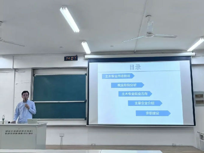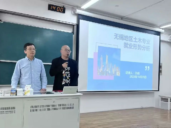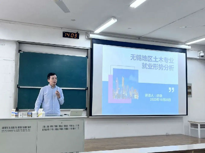 公司总经理兼党委副书记许晓先生在7号教学楼320教室为24届毕业生开展《无锡地区土木专业就业形势分析》专题就业讲座,本活动由智能建造学院党总支副书记余波主持。