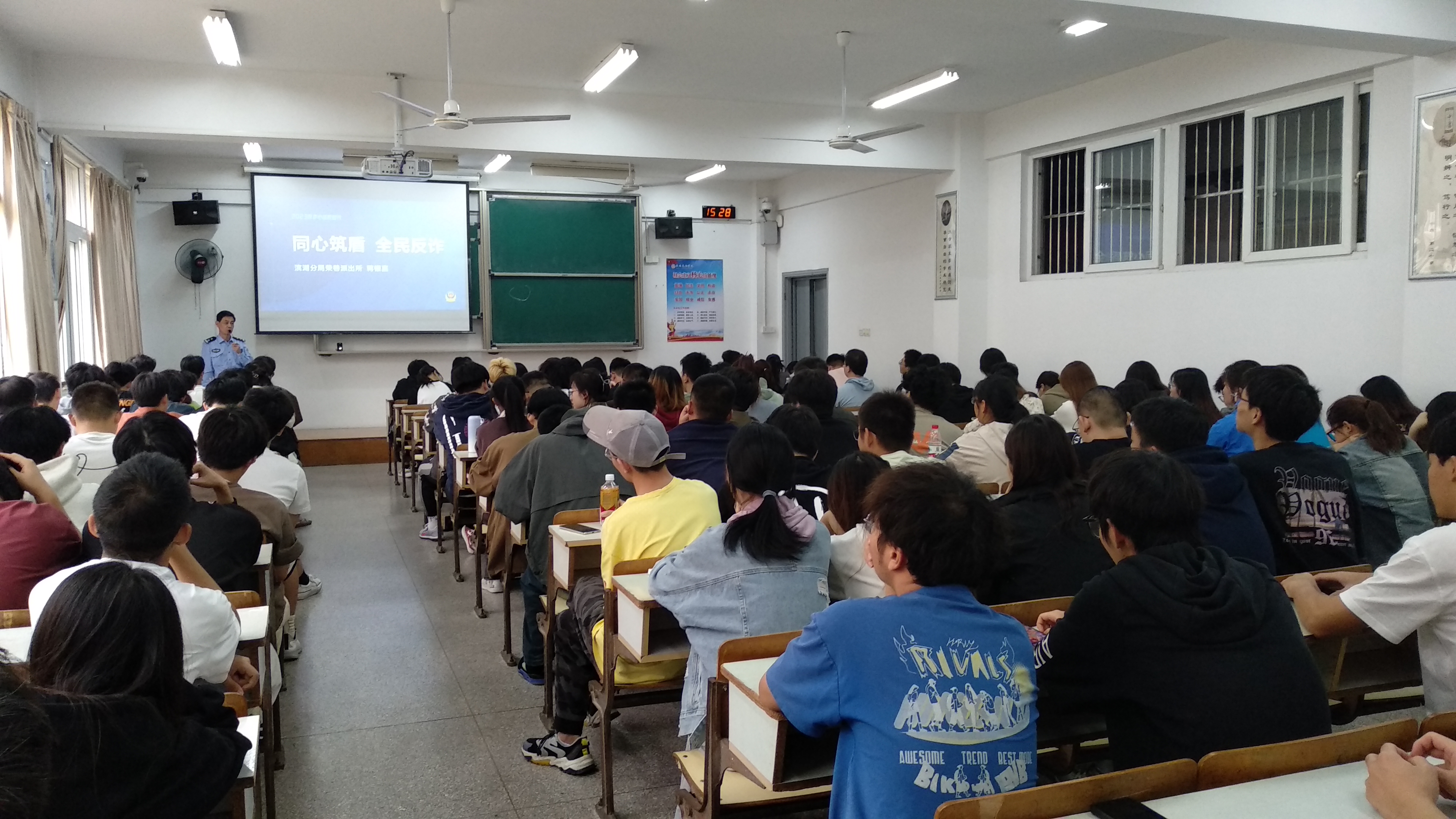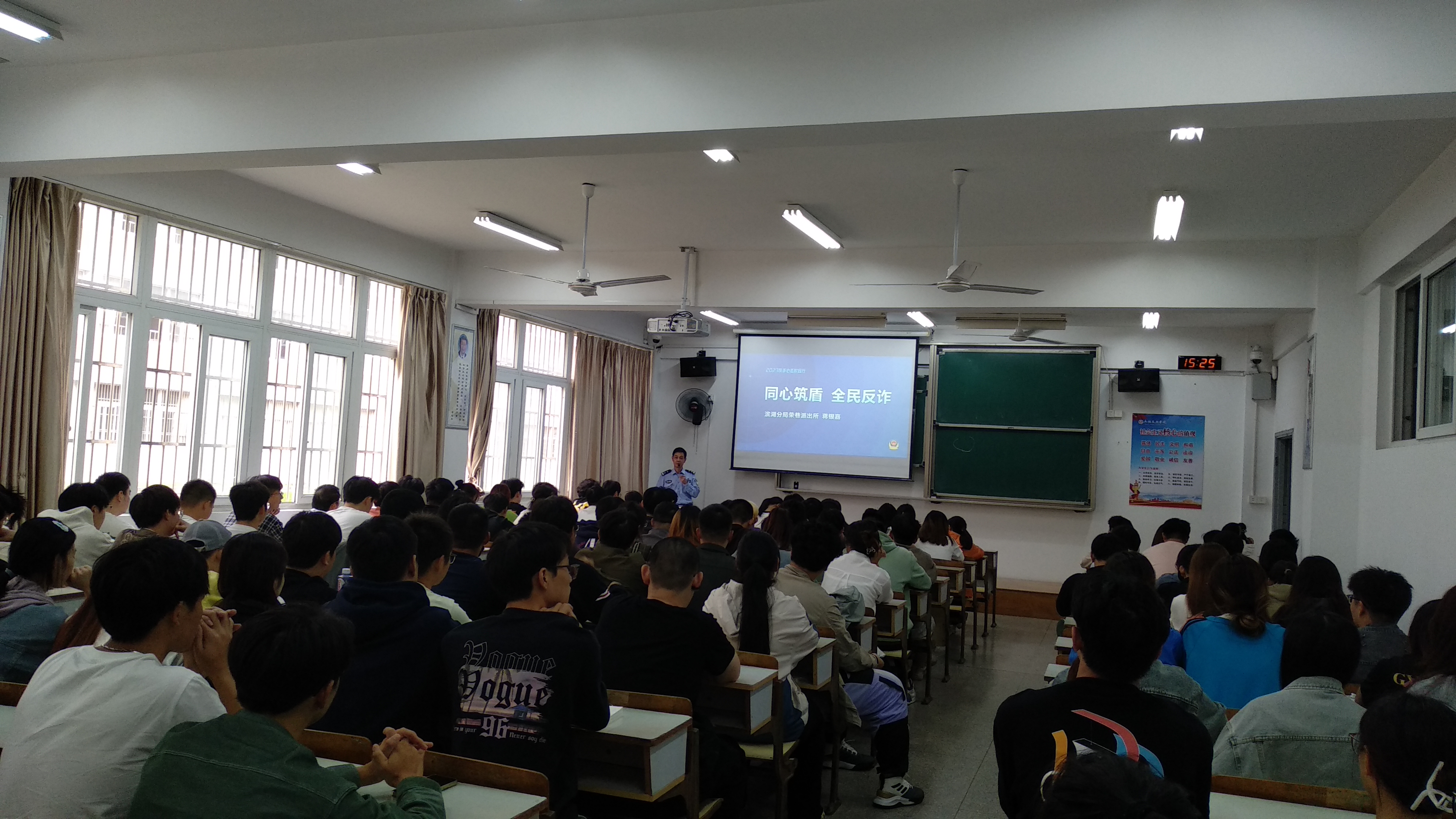 智能装备工程学院于2023年10月25日下午15:10,在七号教学楼106教室成功举办了主题为“共建安全网络,防范电信网络诈骗”的专题讲座。本次讲座邀请了无锡市公安局滨湖分局的驻校民警钟警官,到场的学生为智能装备工程学院大三年级的各班安全委员、全体班委,共计约130余人。