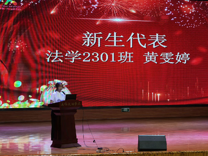 然后,由2023级新生代表法学2301班黄雯婷同学发言。黄同学表示:作为新生,将谨遵校训、院训,增强个人综合素质,树立正确正确三观,脚踏实地,求知求德,砥砺前行,做一名有理想、有品德、有本事、有传承的外语人!