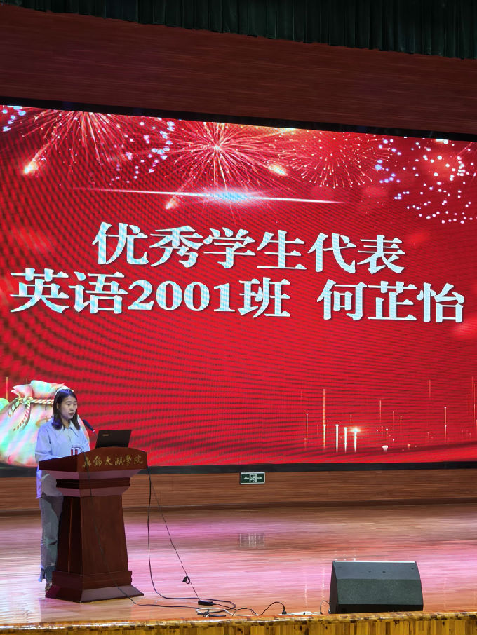 会议第四项议程是由优秀学生代表——英语2001班何芷怡同学发言。