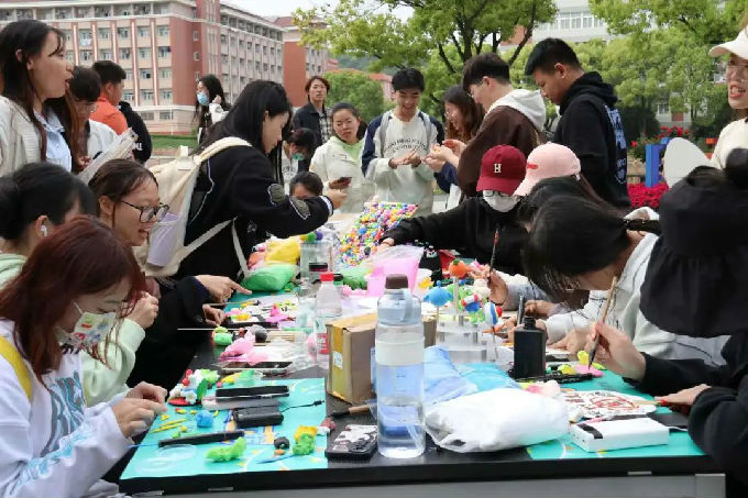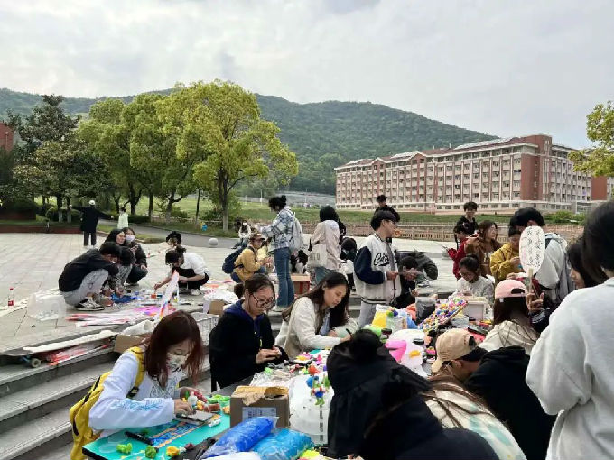 活动在太湖小广场开展,共包含五个板块——“执笔续华章”、“创意手工坊”、“快乐星球”、“相框主题DIY”和“赓续红色血脉”,吸引近500名师生参与其中。同学们通过在风筝和扇子上绘画、设计改造旧物、黏土DIY等方式发挥自己的创意,巧手焕新生,将节约理念融入日常。