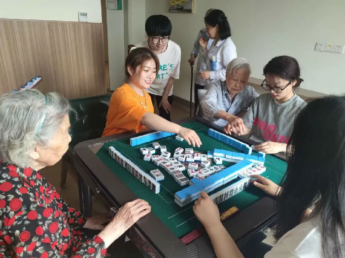 学工助理团“麻将组”“象棋组”在养老院职工的同意情况下,在养老院麻将室陪老人搓麻将,听老人们说,他们常常因为作息时间不同,而凑不齐一张麻将桌四人,“麻将组”的到来正好满足了他们的心愿,大家搓麻将搓得不亦乐乎。“象棋组”和老人们在活动室搭建起棋桌,对弈起来。