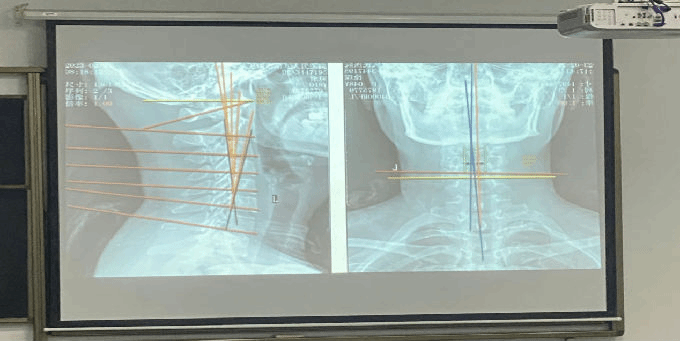 Dr.Juan又给同学们讲分享了人体颈椎神经、胸椎神经、腰椎神经压迫的原因并着重阐述了关于颈椎前屈的相关知识,还为大家演示了其中的一种治疗方法。