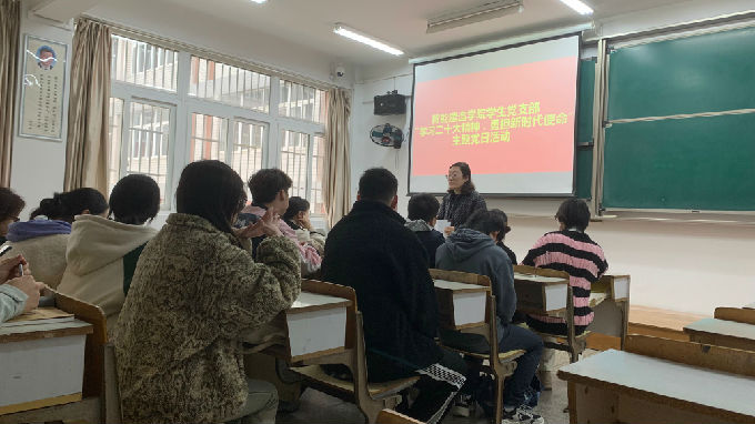 活动第三个环节,王莺老师组织学生党员集中观看党课视频。视频讲述了二十大精神的凝结起源和具体内涵以及党和国家的发展方向,进一步引发同学们对党的二十大精神进行深入思考与理解,促进他们从党的二十大精神中汲取成才的滋养,坚定理想信念。