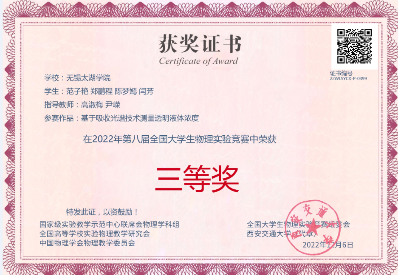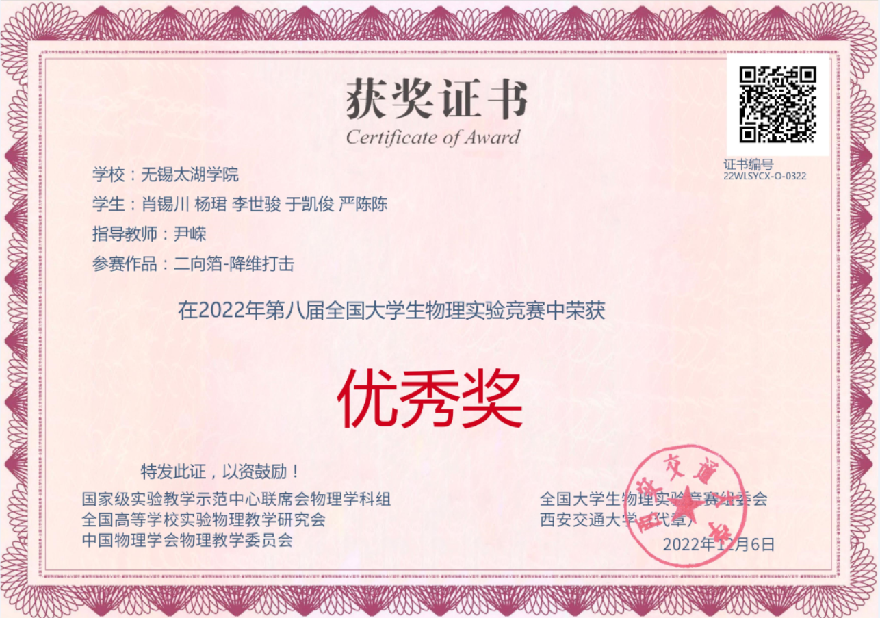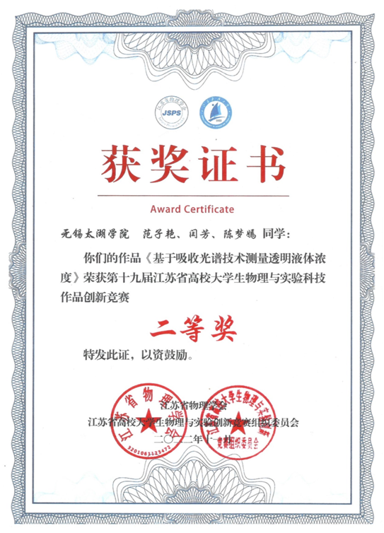 近期,物联网工程学院学子在第十九届江苏省高校大学生物理与实验科技作品创新竞赛以及第八届全国大学生物理实验竞赛(创新)中喜获佳绩。在第十九届江苏省高校大学生物理与实验科技作品创新竞赛中,获省二等奖1项;在第八届全国大学生物理实验竞赛(创新),获全国三等奖1项、优秀奖3项。