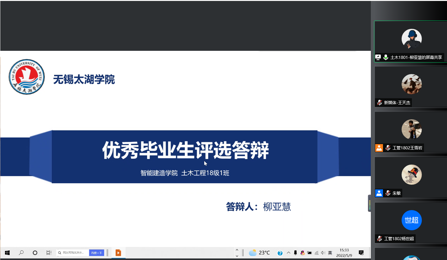 为全面落实立德树人根本任务,深入挖掘、树立和宣传学生中的先进典型,更好地激励和引导大学生勤奋刻苦,培育学生成长成才。5月9日下午,智能建造学院举行无锡太湖学院2022届优秀毕业生评选线上答辩。本次答辩会由学院党总支副书记余波、学工秘书朱敏、毕业班辅导员陈利娟担任评委,共有12位毕业生参与此次答辩。