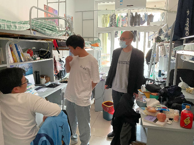 余书记在走访每个宿舍的时候尤其与宿舍长进行了沟通,他强调线上学习期间,宿舍就是同学们的主阵地,宿舍长责任重大,要引导好、组织好、服务好宿舍同学,共同营造好浓厚的学习氛围,保持好良好的作息习惯。