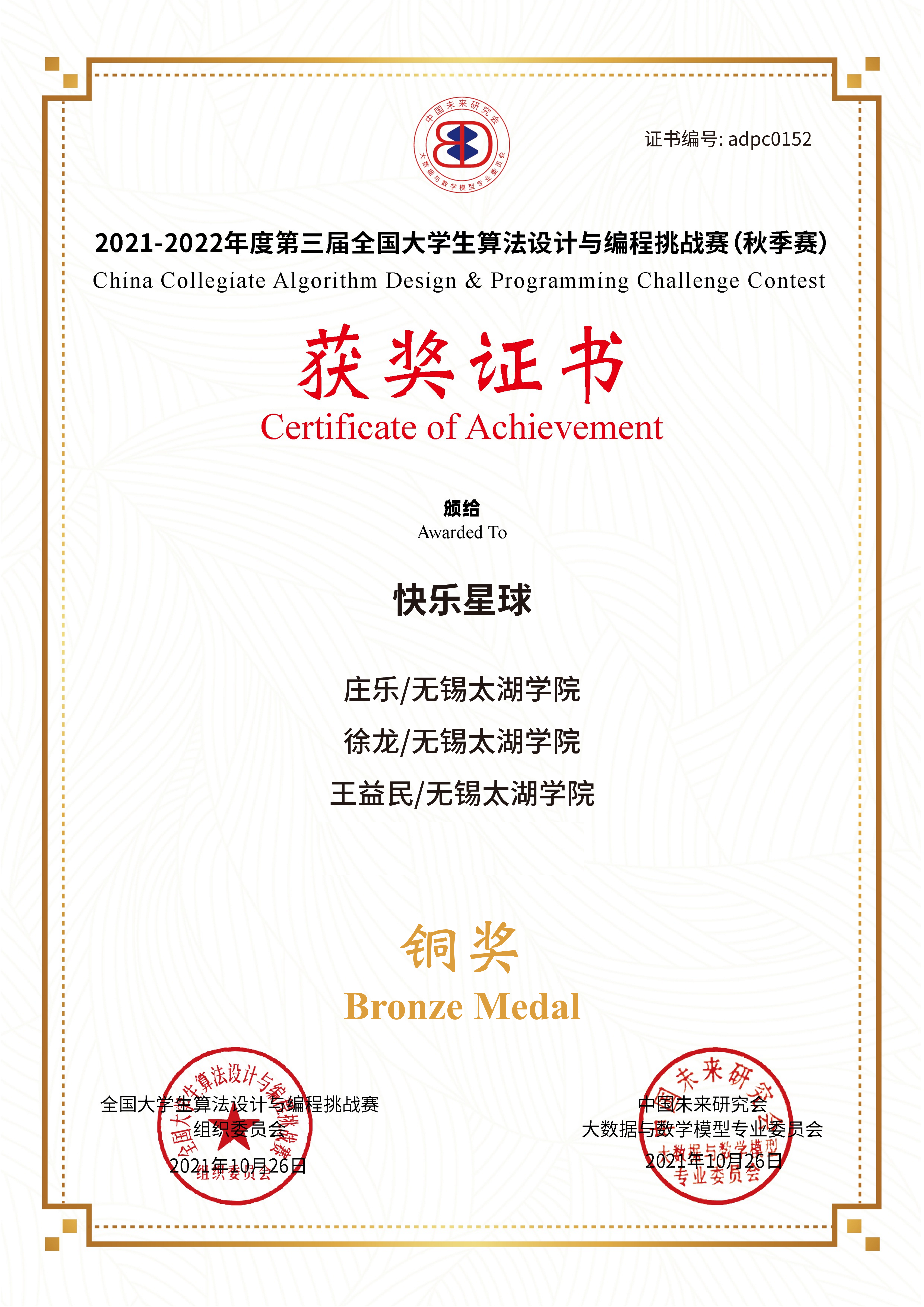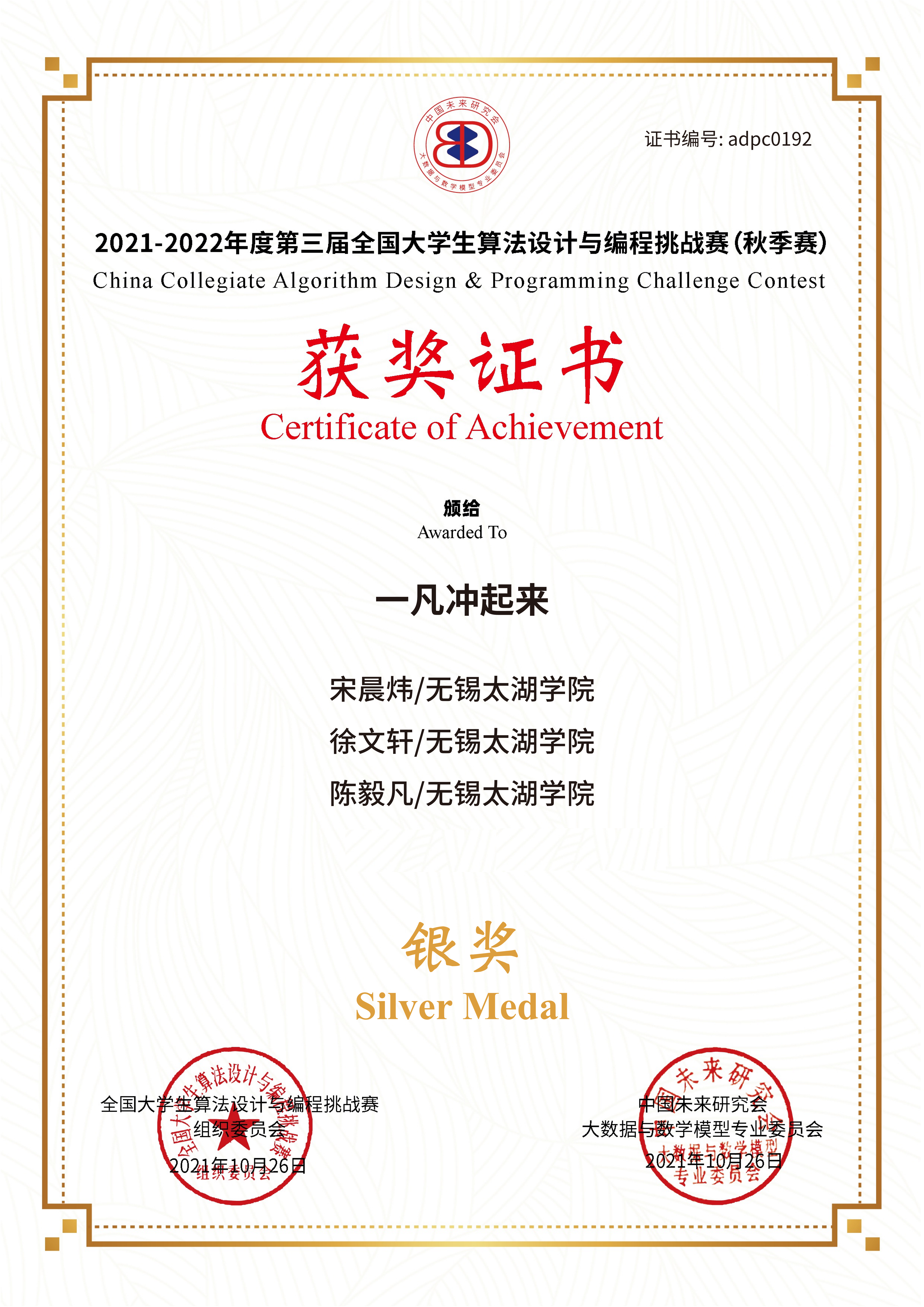 10月26日由中国未来研究会大数据与数学模型专业委员会(国家一级学会)举办的面向全国高校大学生的第三届全国大学生算法设计与编程挑战赛(秋季赛)结果揭晓,来自我院计算机科学与技术和物联网工程专业的宋晨炜、徐文轩、陈毅凡、庄乐、王益民和徐龙六位同学分获全国银奖和铜奖。