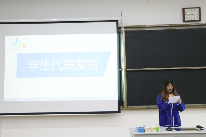 然后是毕业生代表英语1801班沈梦静同学发言。她提出了实习可以增加自身社会经验,讲述了一些关于提升技能水平的一自身经历和自己选择方向上的建议。