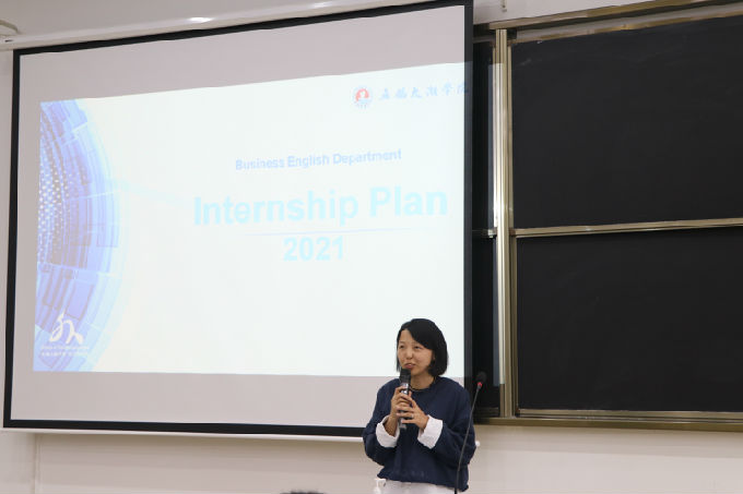 接着是商务英语系副主任马海滢发言。她首先对人才要求做出总结,针对实习可能出现的问题提出一些建议。她提到,“针对实习期间遇到的一些无法自我解决的难题,可以积极寻求工作伙伴或者领导帮助,走出困境和压力。”马老师还讲述了实习期间完成的任务,即学习学分和个人能力等方面注意点。最后是其学习内容,如国际商务、中英翻译、外语教学等等。还对实习要求、安排与形式、成绩与评定进行了简要介绍。