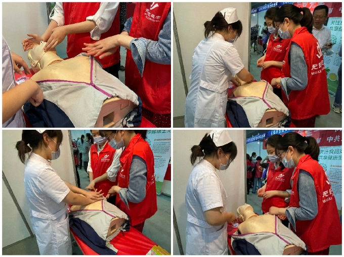 在普及的过程中,两位同学向人们展示海姆立克急救法,鼻出血以及心肺复苏(CPR)的急救操作,而这些操作可以教会人们处理日常生活中经常会出现的一些紧急情况。两位同学互为模特,生动形象地向人们展示海姆立克的几种情况以及鼻出血的急救措施;利用模拟人展示心肺复苏的操作,仔细讲解按压等一系列操作中会出错的注意事项。