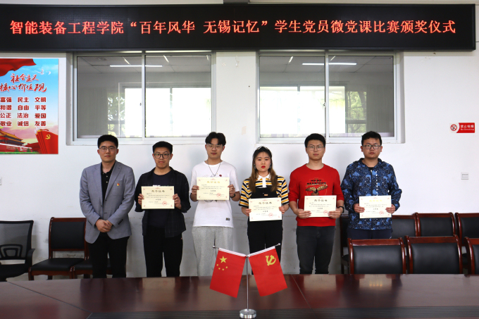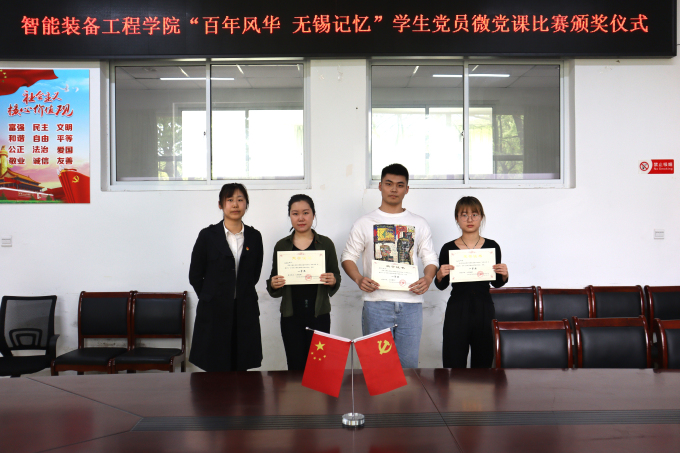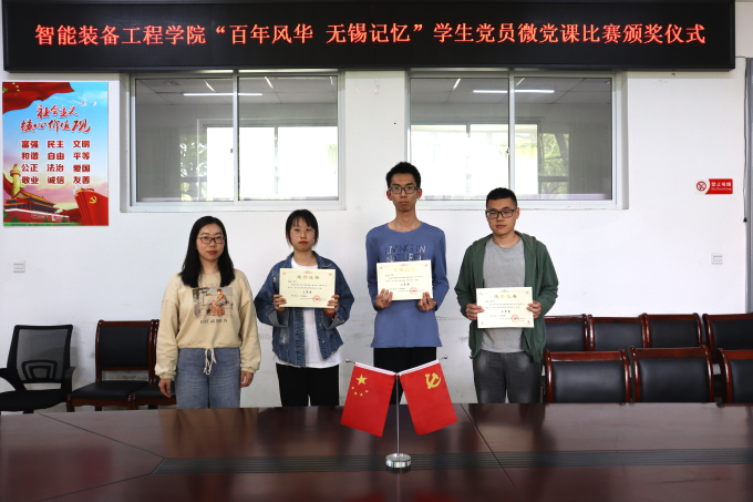 为深入学习贯彻习近平新时代中国特色社会主义思想,隆重庆祝中国共产党成立 100 周年,智能装备工程学院于3月底至4月中旬在学院内展开“百年风华 无锡记忆”主题学生党员微党课比赛。4月29日,智能装备工程学院在学院会议室组织召开本次比赛的总结暨颁奖仪式,与会的有智能装备工程学院党总支副书记杨学圣,学生党支部书记许心怡,学生第二党支部书记、团总支书记丁苗,以及全体学生党员,邀请校党办辛怡老师作为嘉宾参会。