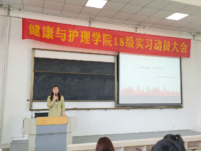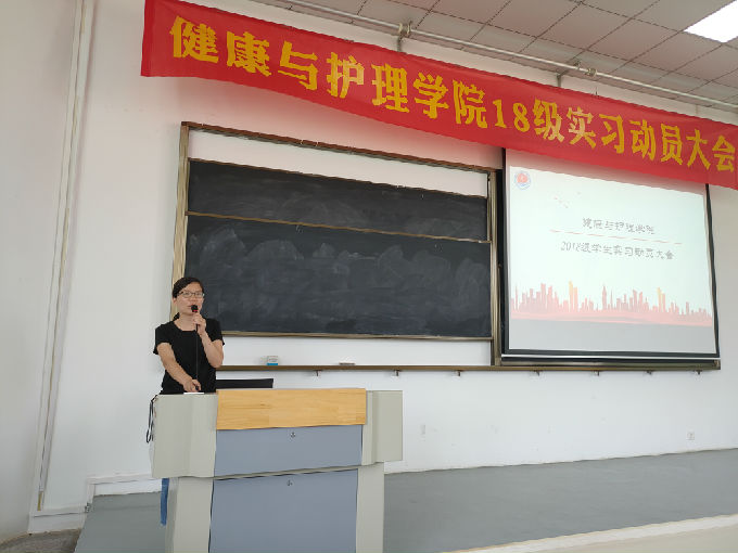 活动伊始,闵娟娟老师介绍了本次活动的主旨,意在提醒大家实习前做好准备工作,以及今后实习的注意事项,希望每位学生能够顺利完成实习工作。随后,健康与护理学院系主任杨小仙老师为本次活动致开场词,她为同学们的实习生活及未来就业进行了指导并提供了一些实质性的建议,强调学生在医院一定要保护好自己,一定要遵守医院的规章制度,以及实习之后要注重与病人的沟通。