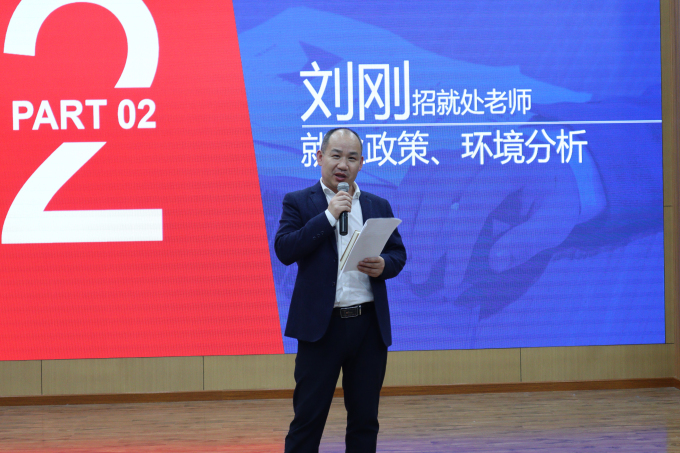 招就处刘刚老师,通过分析目前复杂严峻的就业环境与政策,以此来帮助学生找准自己定位,高校鼓励学生报考参加研究生、公务员、入伍当兵、三支一扶等形式就业,多尝试多思索,从而找到更适合自己的岗位。