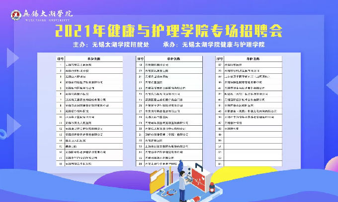 2021年4月27日,无锡太湖学院健康与护理学院在校举办了2021届护理专场招聘会,招聘会现场人头攒动、氛围热闹,每家单位前都挤满了前来咨询的学生,今年将会有193名毕业班学生走向工作岗位。参会单位也对本次招聘会非常重视,希望与学校加强后期联系,进一步开展校企合作,建立实习实训就业基地,提前为医疗机构做好人才储备,也为毕业生搭建实践平台。学院领导也高度重视,健康与护理学院副院长周鸣鸣、党总支副书记胡宇、学工秘书马晓星、毕业班辅导员马莉都到场参与指导学生就业事宜。