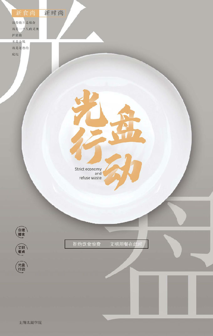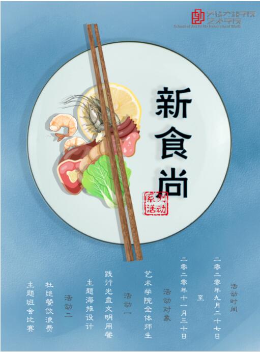 为贯彻落实中共中央关于厉行节约、反对浪费的重要精神,在全院师生中营造节约粮食、杜绝铺张浪费的良好氛围,切实培养当代大学生勤俭节约的习惯,艺术学院积极响应上级号召于2020年9月27日至11月30日开展了“新食尚”系列主题活动。