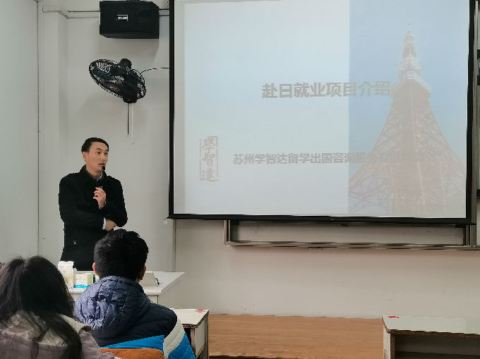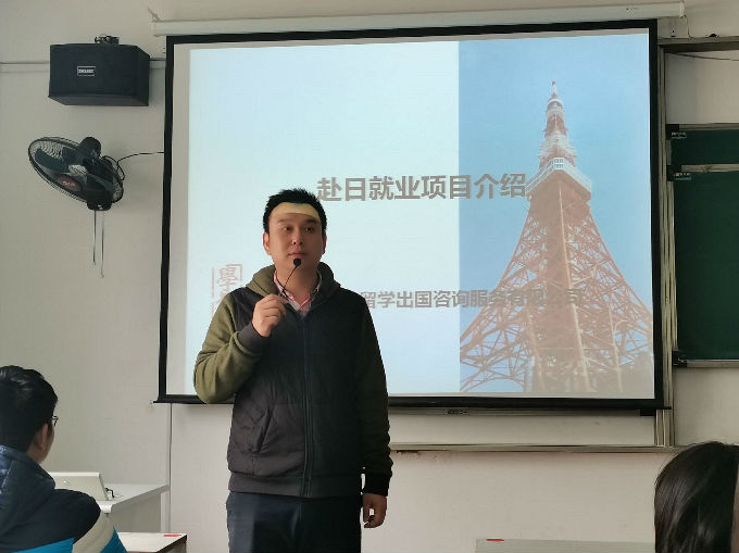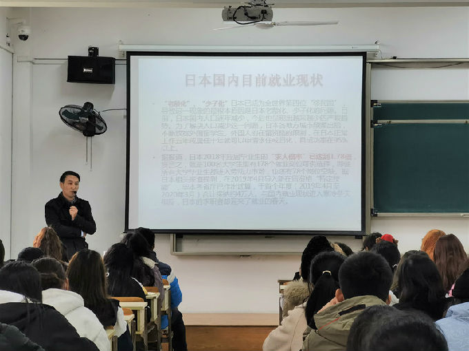 首先,主讲人以一张景点的图片向同学们简单地介绍了日本,讲述了日本的地理位置。接着,他以两个视频讲述了日本国内目前的就业现状,日本的老龄化、少子化使得同学们以后有更多的机会赴日就业。随后,他向同学们介绍了赴日本工作人员的情况:1.工资相对较高2.八小时工作制3.与日本大学生同工同酬。接着,他向同学们介绍了关于工作签证的类别、在留资格认定书、工作签证与研修签证的区别。为此,他还详细地向同学们介绍了申请工作证的要求、日本语言能力测试、赴日就业办理流程、关于日本的社保以及部分的招聘岗位。