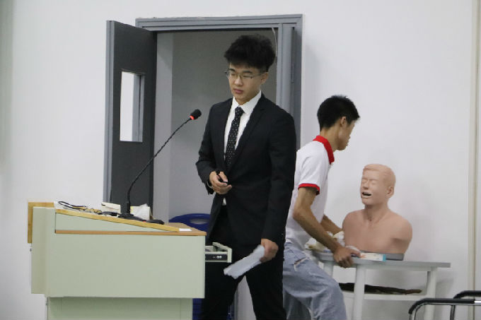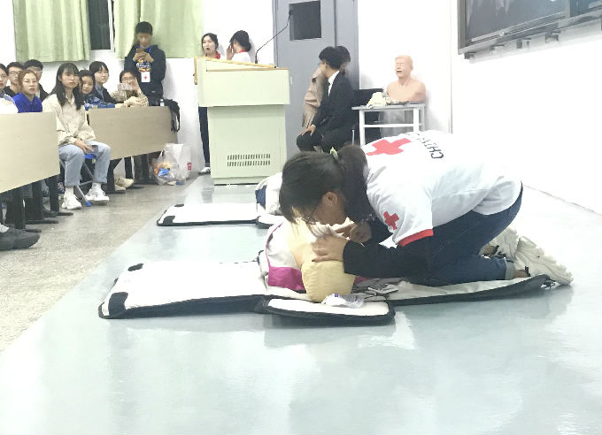 首先展示的是心肺复苏(CPR),CPR分为三个步骤——胸外按压,开放气道,人工呼吸,简称CAB。活动主讲人通过实际操作演示、PPT展示、视频讲解以及现场请同学体验并指导,极大提高了同学的兴趣和学习效率,现场气氛十分火热。
