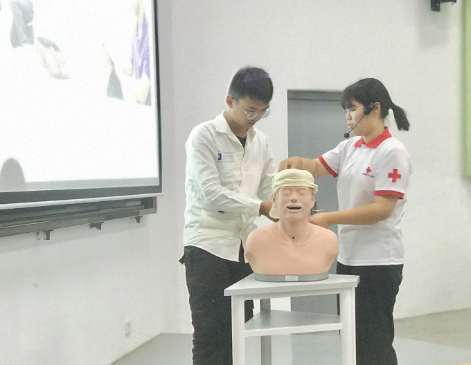 接下来是两项包扎的项目,头顶部右侧大出血和左前臂中段闭合性骨折。主讲人绘声绘色、妙趣横生的演讲让现场观众的目光都聚焦在了台上。请在场观众上台体验的环节更是把现场的气氛推向了高潮。